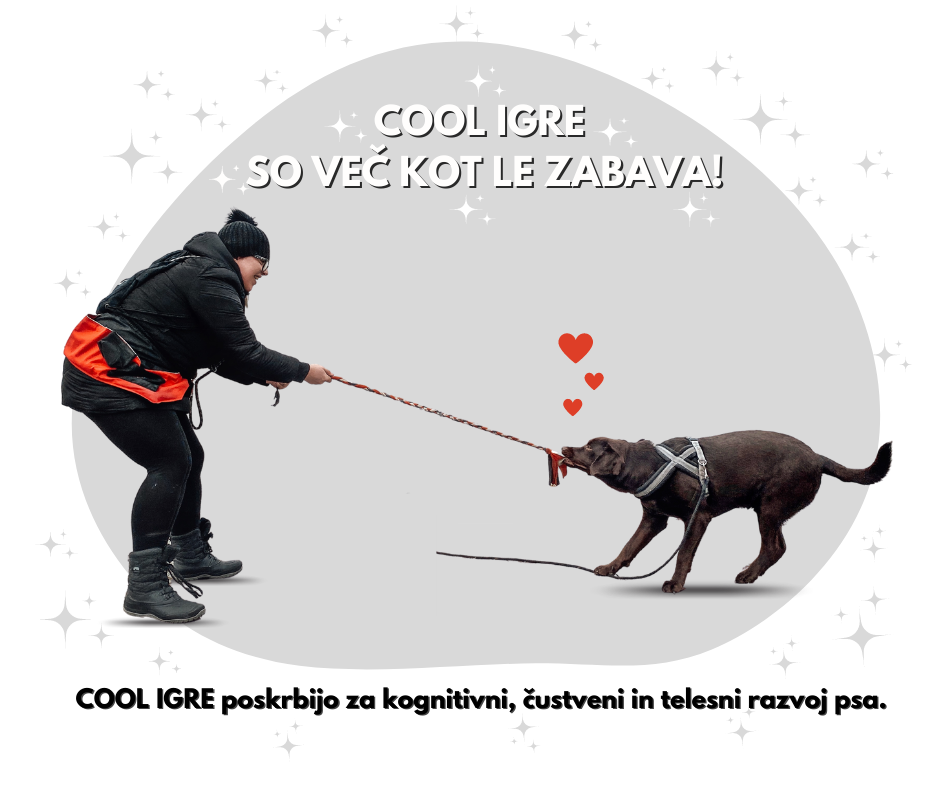 Zate in tvojega psa sem razvila COOL IGRE za COOL LASTNIKE, ki ti v le 10 minutah na dan pomagajo, da svojemu psu omogočiš najbolj COOL zabavo, zadovoljitev njegovih naravnih nagonov, obogatitev njegovega vsakdana, umirejnost in stabilnost v urbanem okolju, ti pa si v svoj vsak dan vneseš več miru in časa tudi zase.